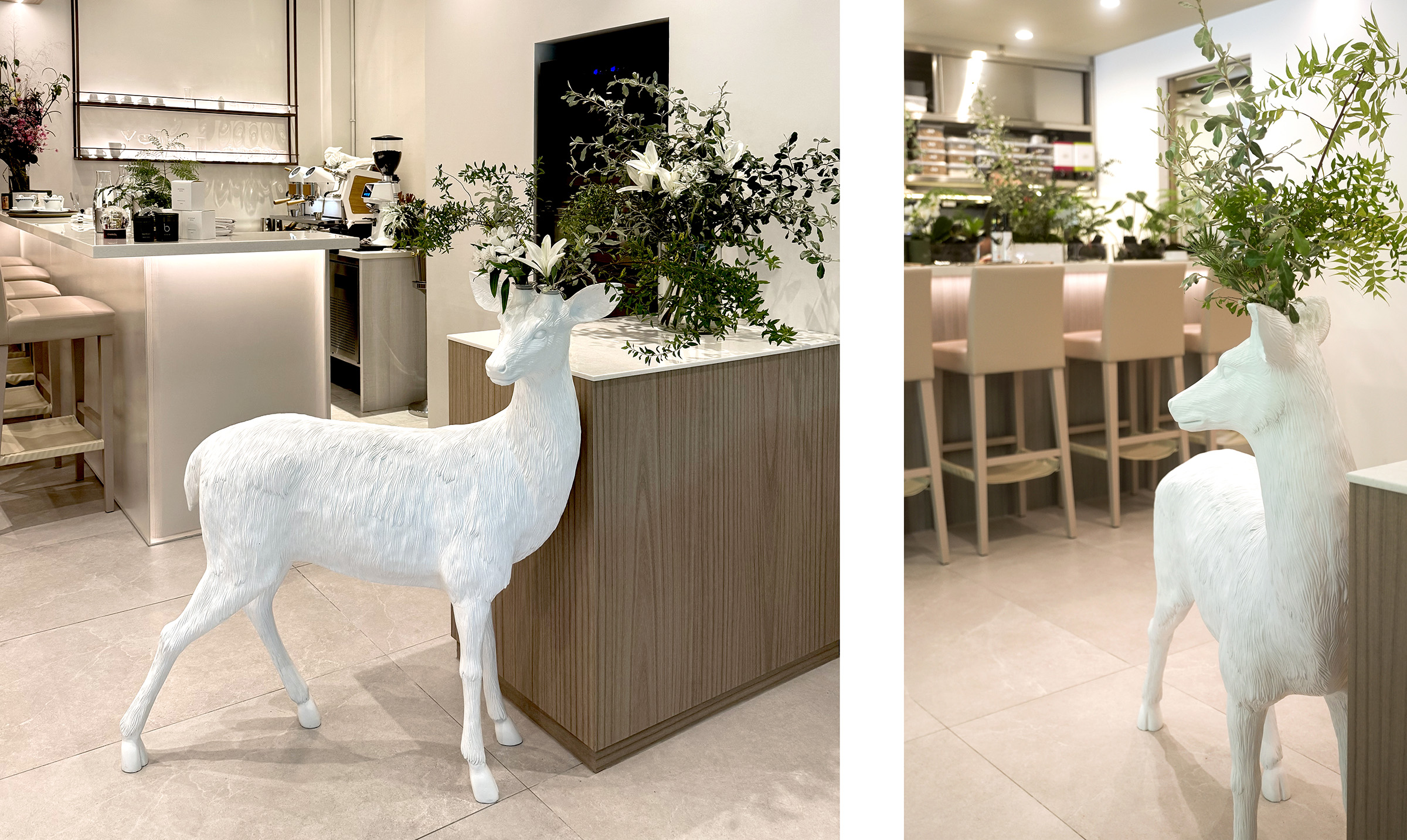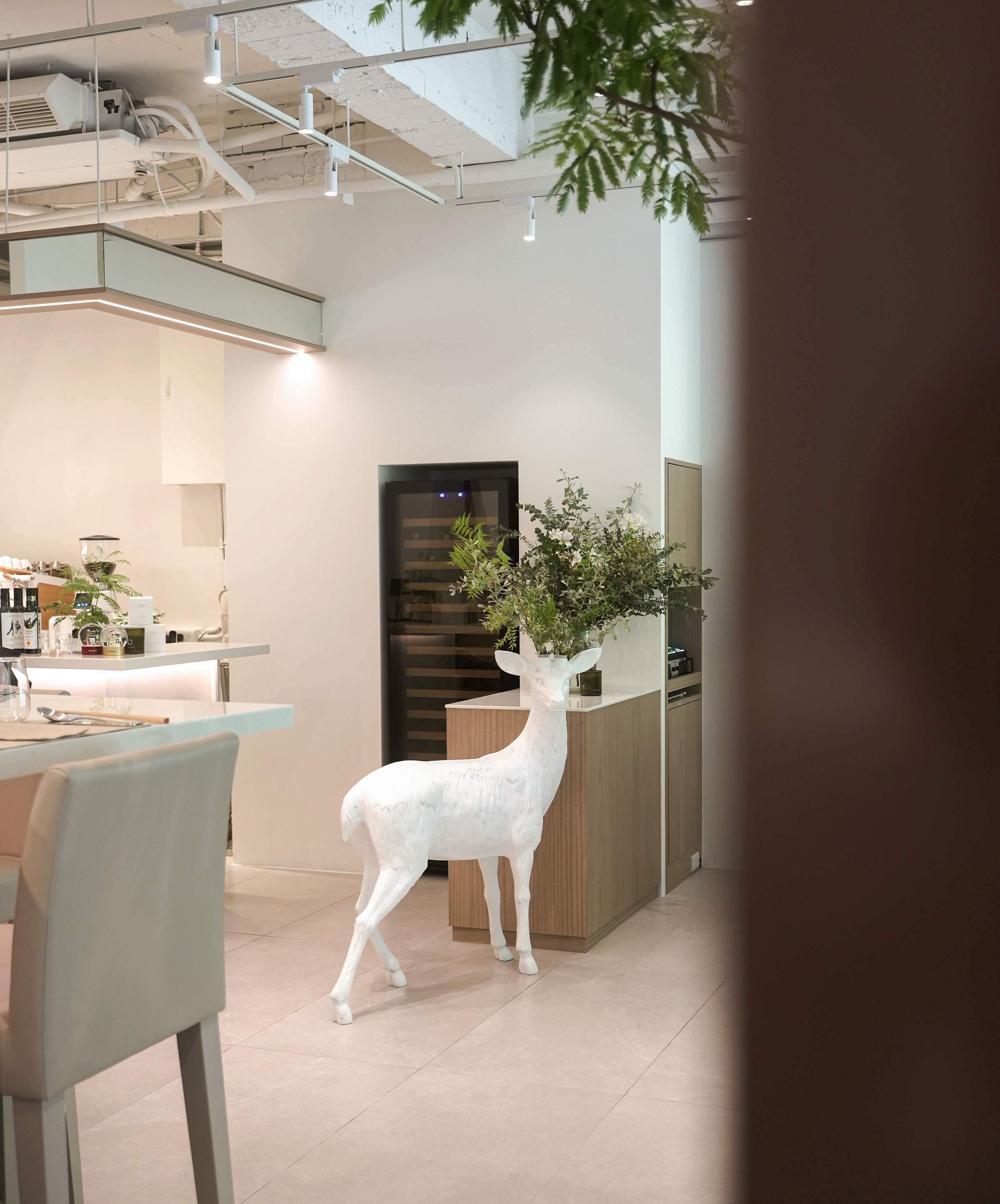 靠近鋼琴演奏區的位置,還能看見另一件熟悉的作品——Deer Vase 小鹿花器。這是一款落地式花器,小鹿以安靜沉穩的姿態站立著,花器中插著幾枝新鮮綠植,簡單卻帶來一種柔和的存在感。不同於候鳥時鐘帶來的動感與流動,小鹿更像是一位靜靜守候的角色,為這個空間添上一份溫柔的陪伴。