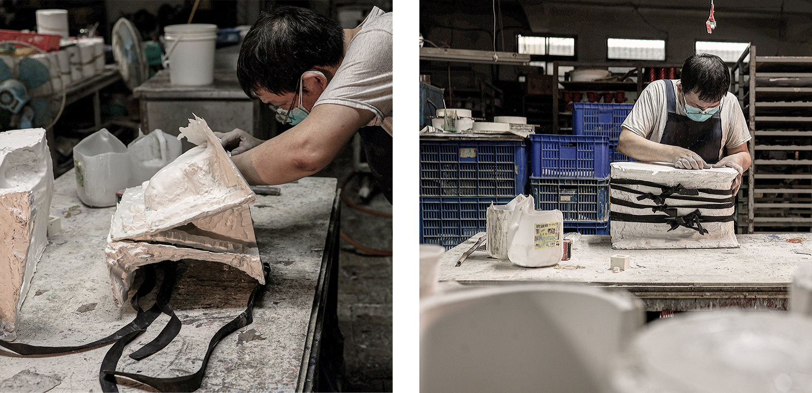 將完美比例混合的漿料倒入一個模具中,藉由不斷地翻動,讓漿料平均到每個角落,使其硬化和乾燥。掌握在完美的時間將產品從模具中脫模,這本身就是一種技巧。作品必須幾乎完全硬化,但保留材料原先韌性,這樣才能進行修整。