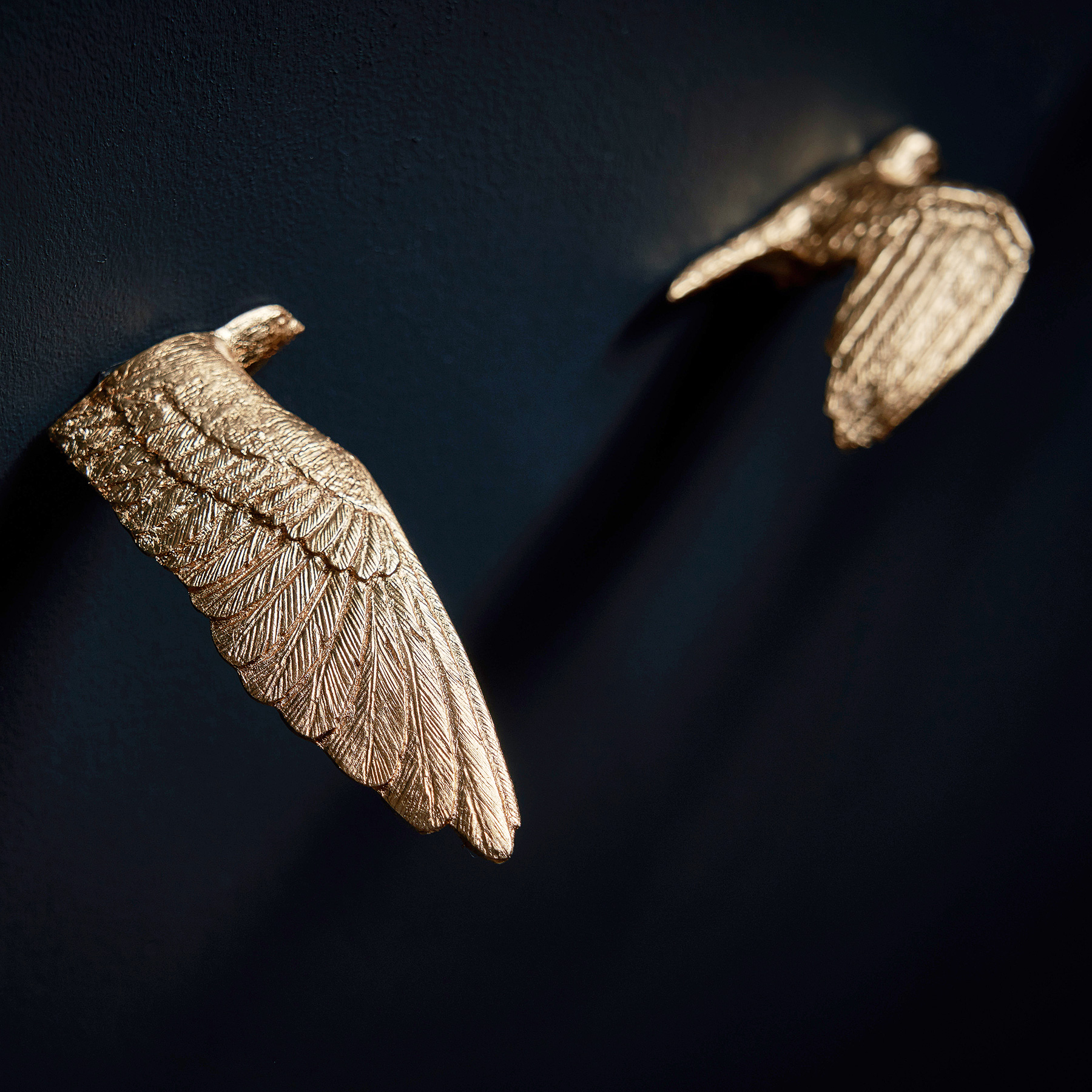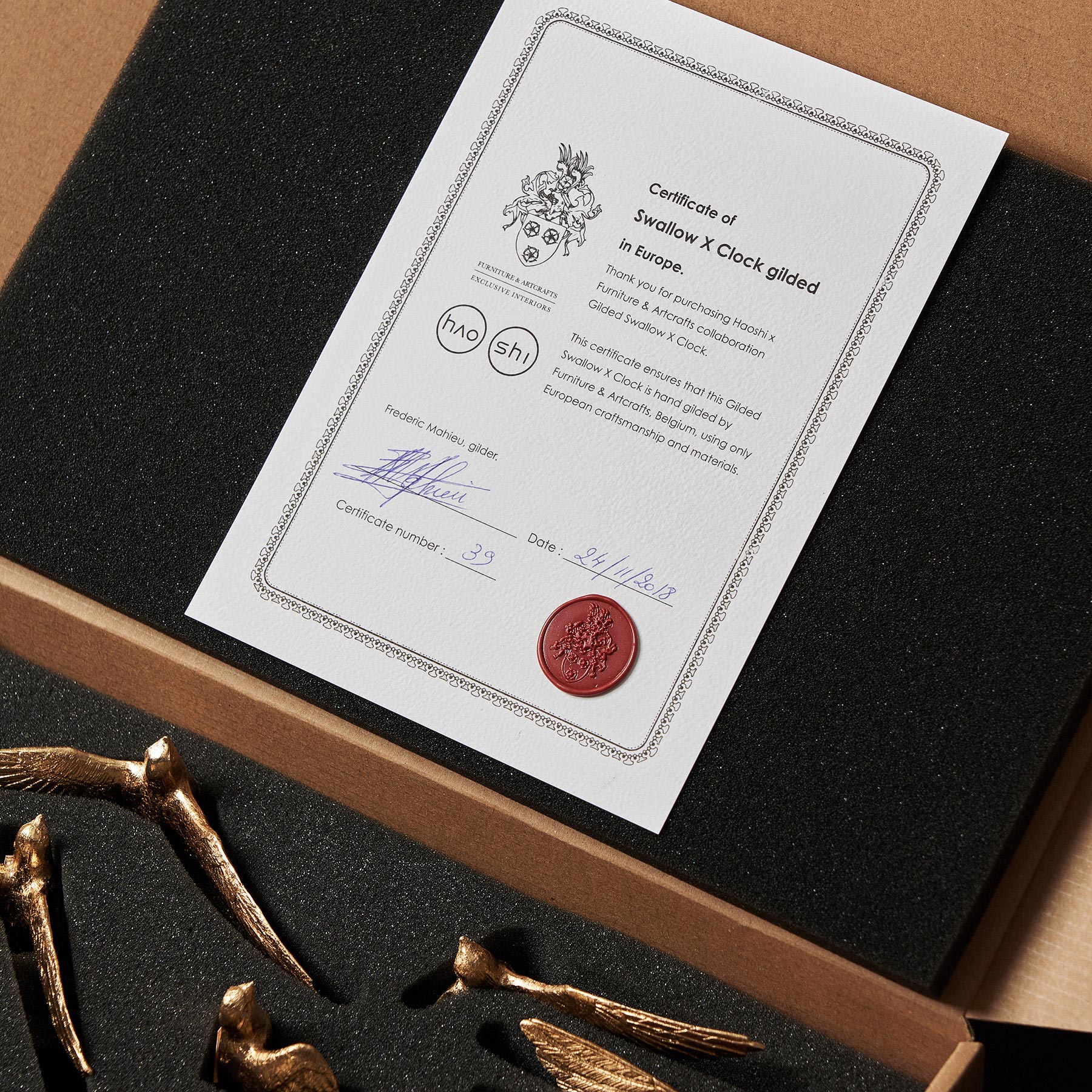首度跨國合作,與歐洲鍍金師工藝交流。 haoshi的經典-燕子時鐘加上了黄金色的箔片。每一張小箔片都經由鍍金師一片一片壓貼到燕子的表面, 箔片令翅膀羽毛紋理凸現更鮮明,整組時鐘都充滿著鍍金師的用心。