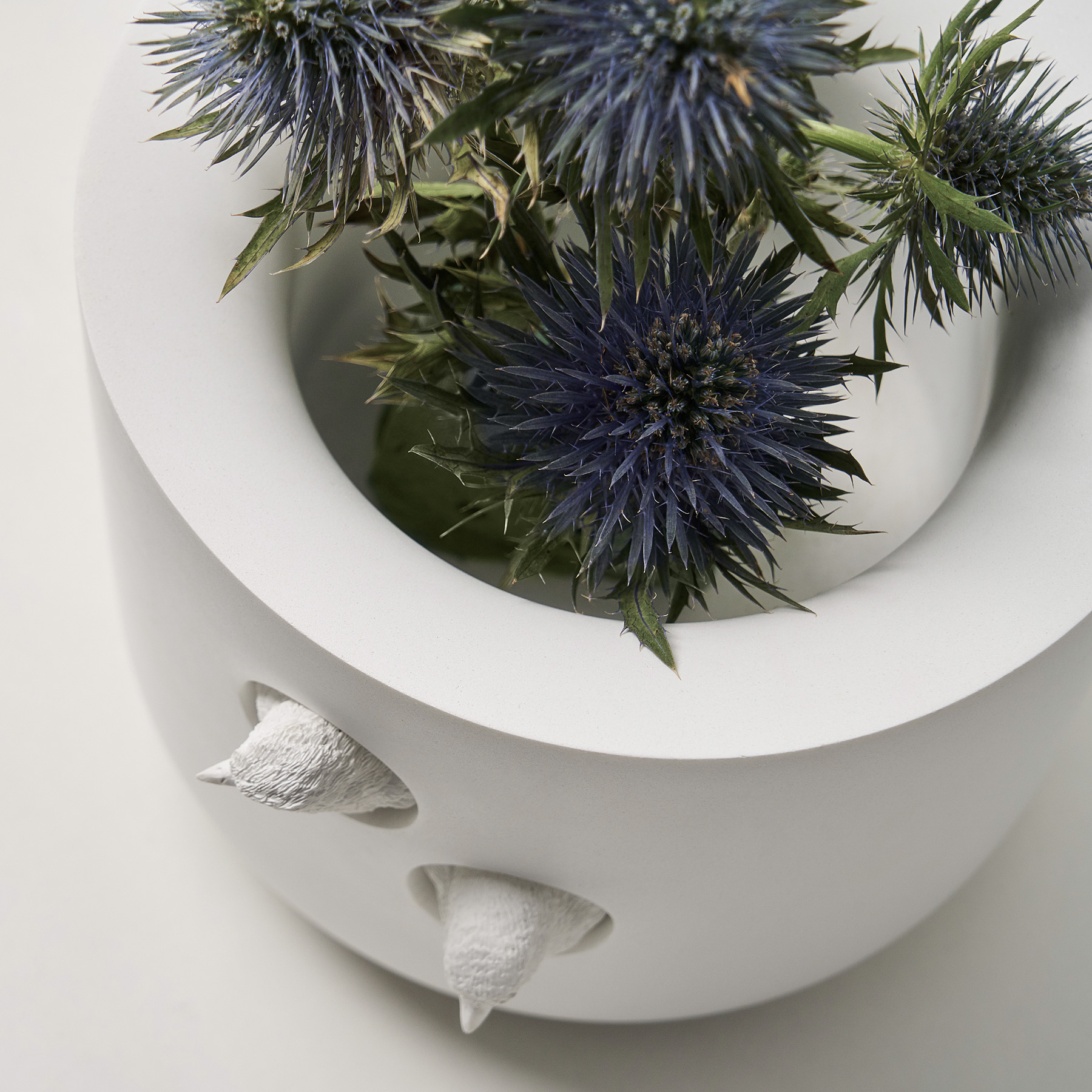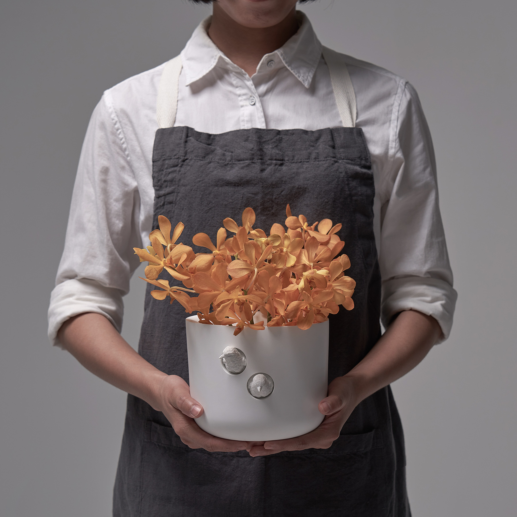 良事設計創作出一只由大理石的細密與淨白所打造的純粹器皿。 在圓滑的弧口裡,各式花卉植草在此舒適安置,恣意綻放每個美麗身影。