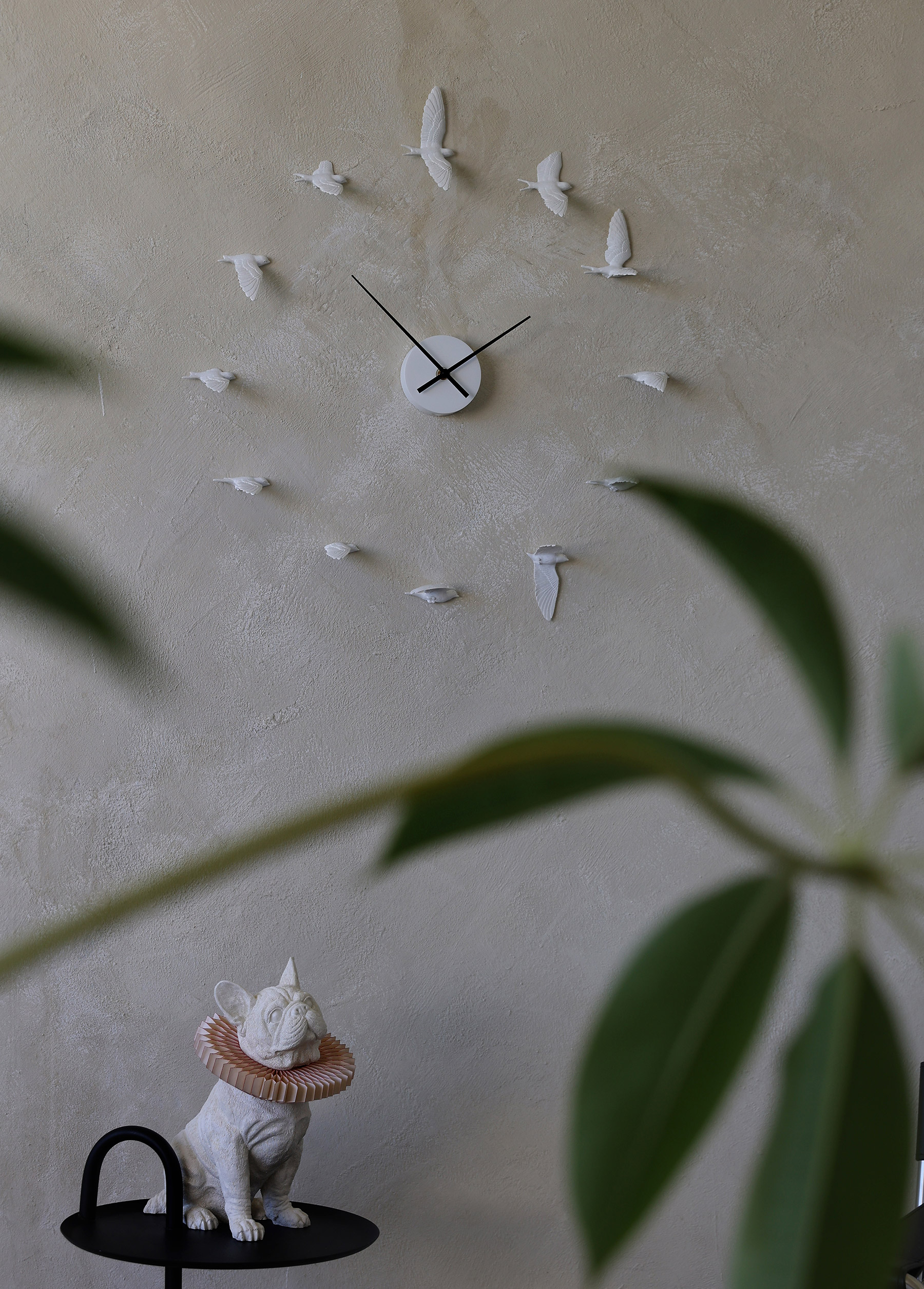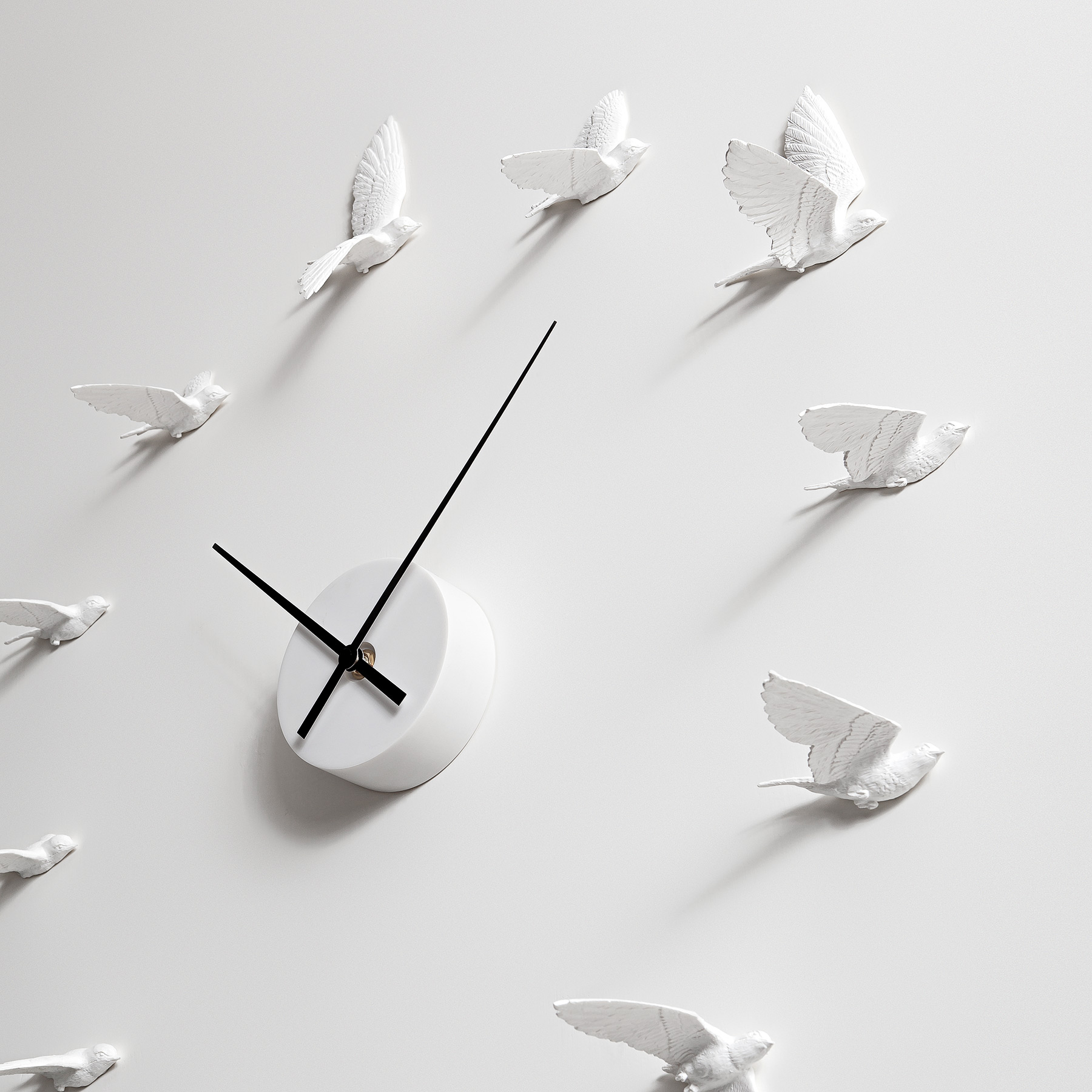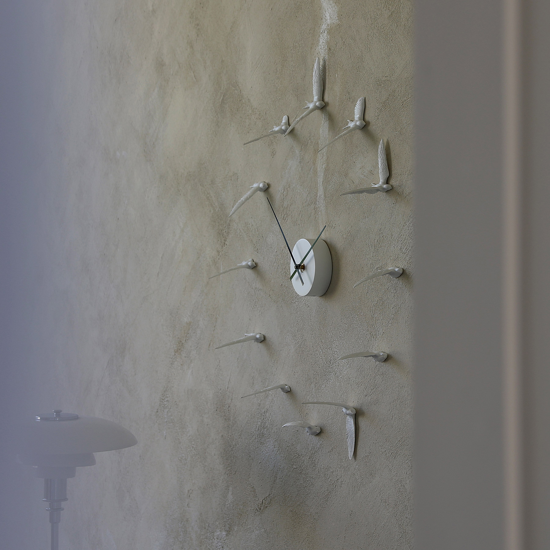 以十二隻不同角度飛翔的燕子,取代時鐘上刻板數字,燕子飛舞的動作凝結於瞬間,時間卻不停的往前走,把靜止和流動兩種美感,融合其中。
