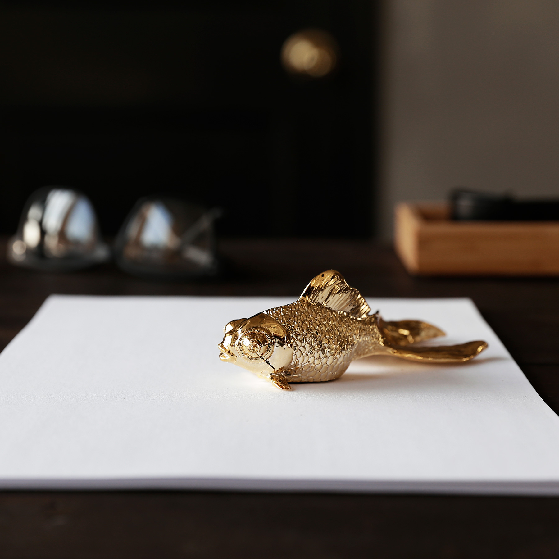 金魚皆為東方與西方討喜的生物。良事設計的金魚紙鎮,從魚鱗鱗片不同層次的深淺刻劃,金魚身型不同弧度的利落感。結合老師傅純熟的雕刻手藝,栩栩如生的表現出金魚在池塘中優游的姿態。